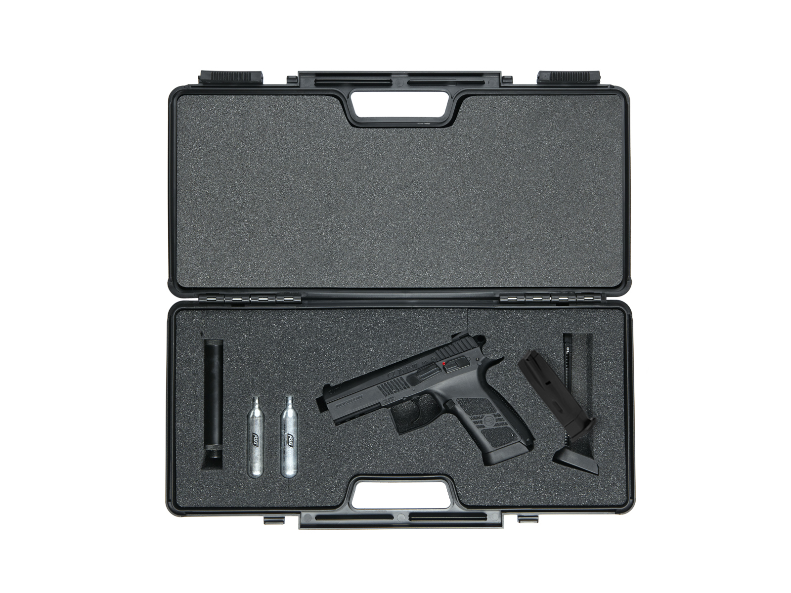 Bir tabanca, bir Şarjör,Bir susturucu, airsof silahları için iki CO2 tüp ve bu aksesuarlar için köpük kesme-çıkışları bulunmaktadır.