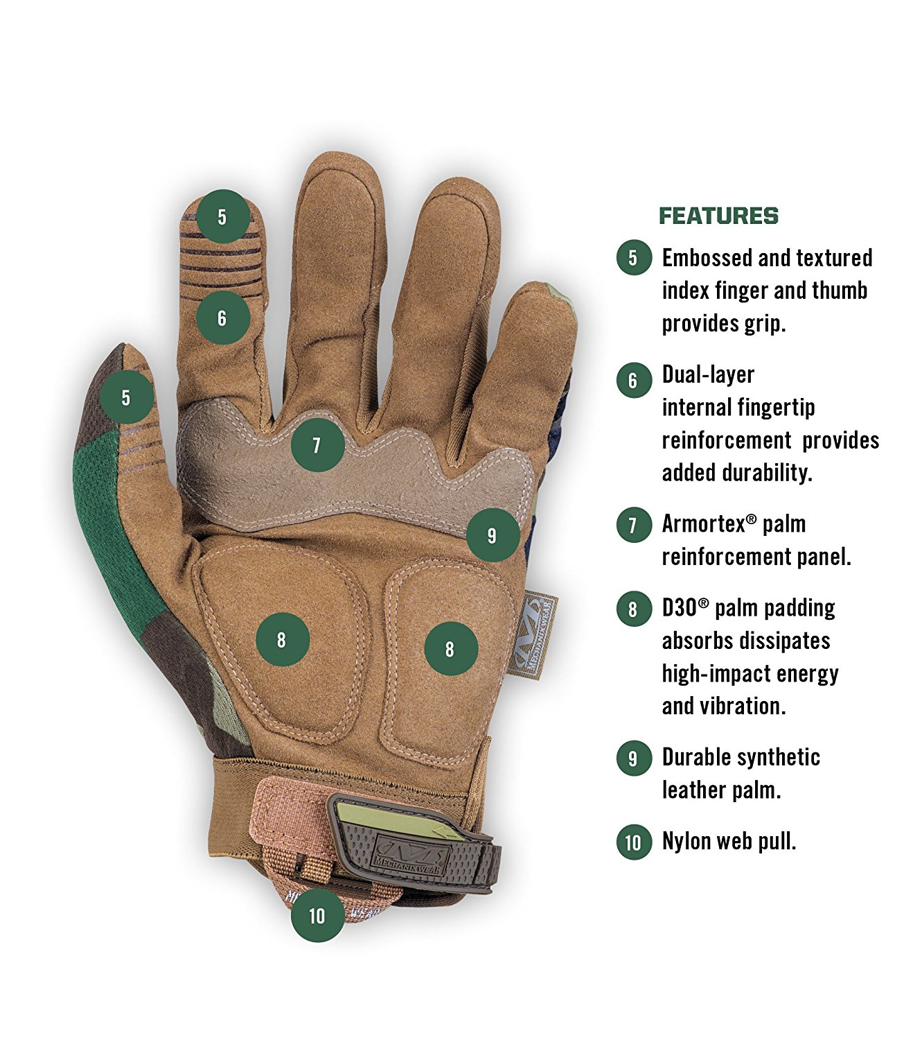 Dual-layer internal fingertip reinforces the index finger and thumb for added durability.